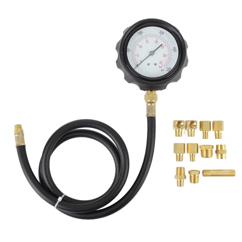 - Accurate Oil Pressure Testing: Quickly and accurately measure engine oil pressure (0-500psi / 0-35bar) to diagnose issues like clogged oil strainers, faulty pressure valves, or incorrect oil viscosity in the lubrication system., Complete 12-Piece Kit with Versatile Adapters: Includes a 3-1/2 inch gauge, a 40-inch rubber nylon resin hose with a 1/8in NPT brass adapter, and multiple brass adapters (3/8in, 1/4in, 1/8in, 1/16in NPT) for a universal fit on most vehicles., Easy to Use for Multiple Vehicles: Simply remove the low oil pressure switch, attach the suitable adapter, start the engine, and read the pressure. Ideal for cars, motorcycles, ATVs, trucks, and other gasoline engine vehicles., Durable Construction & Reliable Readings: Features sturdy brass connectors and a large, easy-to-read dial. The gauge pointer automatically returns to zero after measurement for consistent, reliable diagnostics., Professional Diagnostic Tool for Transmission & Engine: Tests both engine oil and automatic transmission fluid pressure. Helps verify pressure against manufacturer specs, making it an essential tool for professional mechanics and DIY enthusiasts.