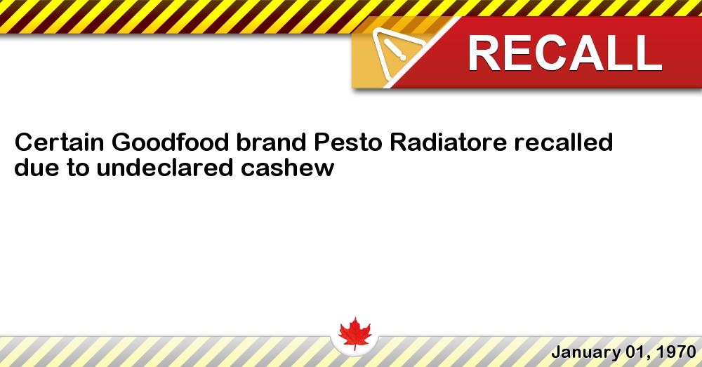 Goodfood Market Corp. is recalling certain Goodfood brand Pesto Radiatore from the marketplace because it contains cashew which is not declared on the label.